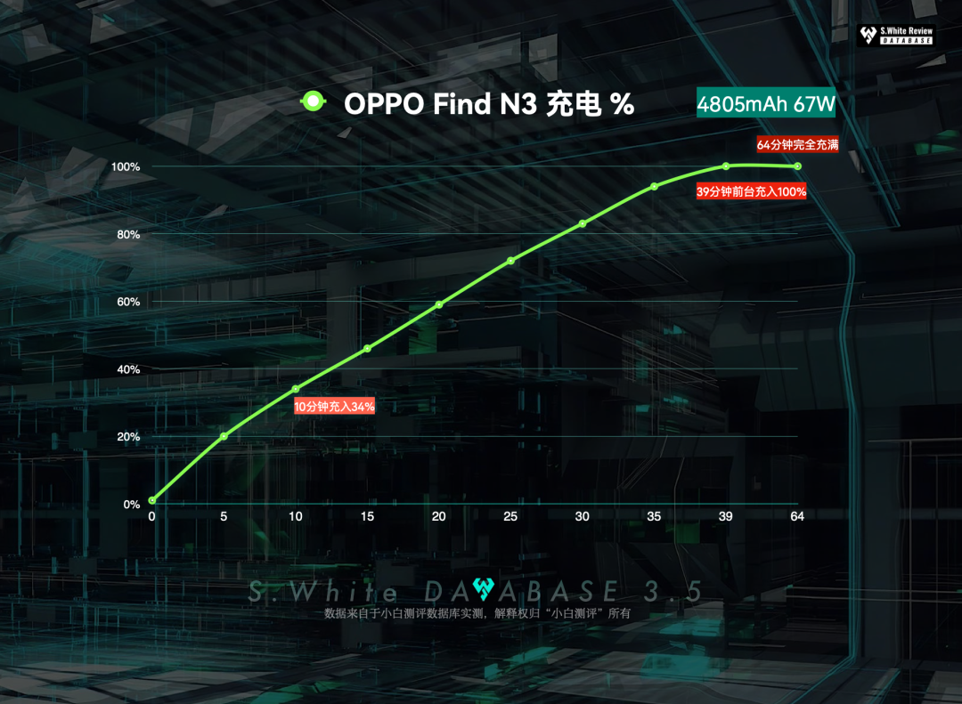 3、充电实测:4805mAh电池,67W有线充电,OPPO Find N3在25℃标准测试环境中,峰值功率57W,10分钟充入34%,39分钟前台充入100%(实际充入92.55%),64分钟完全充满。