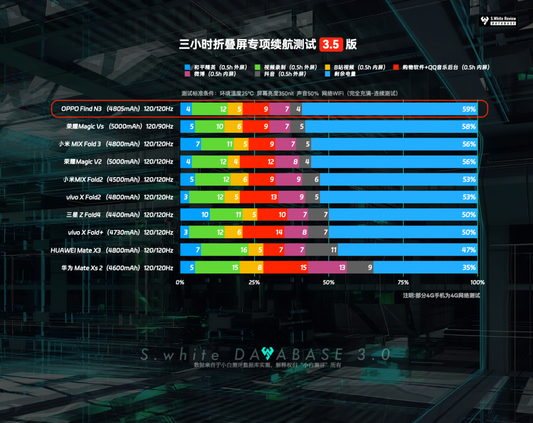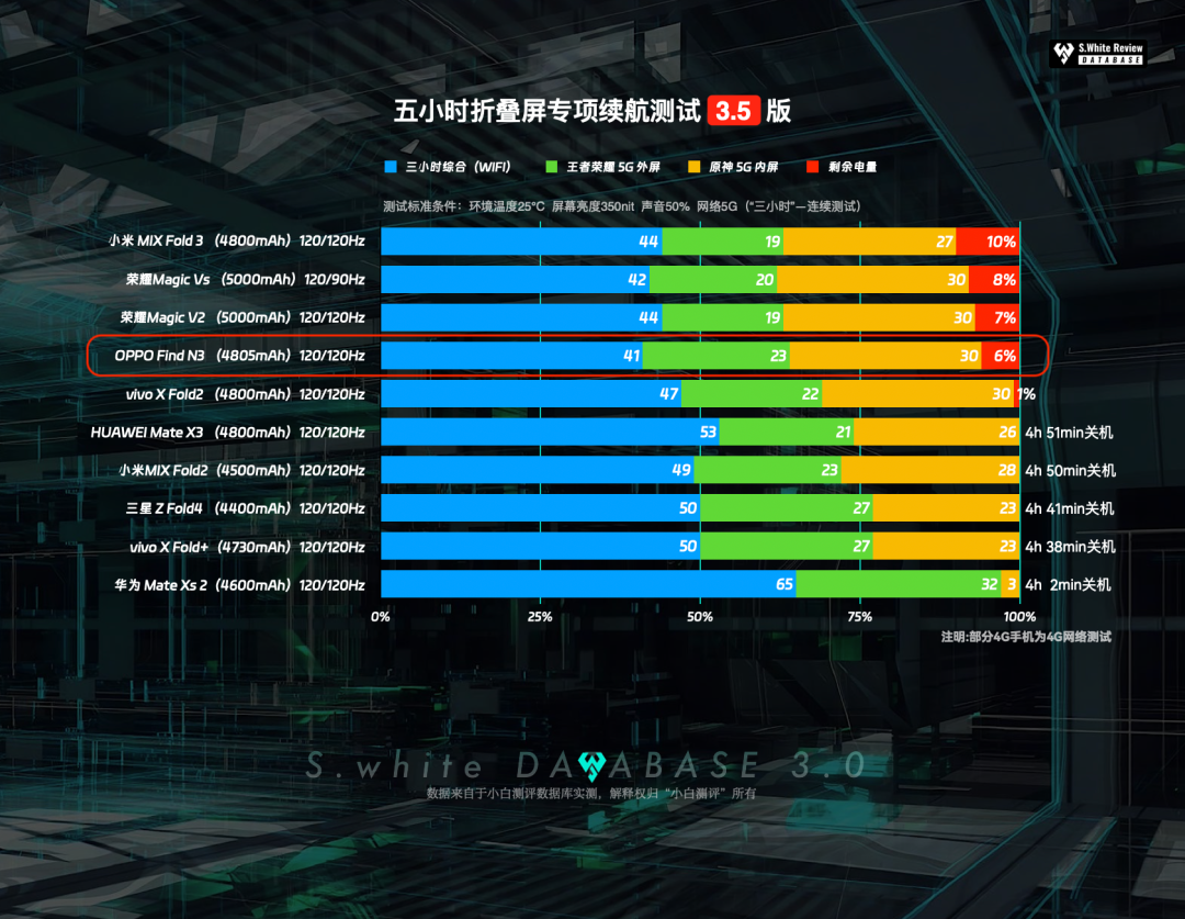 以上均基于小白测评数据库模型测试,测试标准条件:环境温25℃±0.5℃,屏幕亮度350nit,声音50%(5小时重度续航、极限续航测试:性能模式)(数据基于 OPPO Find N3 测试时最新版PHN110_13.2.0.92(CN01) 系统测试)