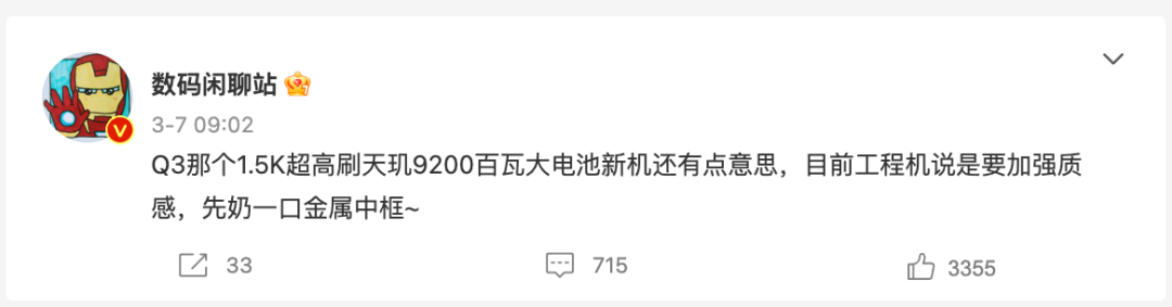 据91mobiles援引数码闲聊站消息报道称:Redmi K60 Ultra(K60至尊版)或将搭载联发科天玑9200处理器,配备百瓦充电、大电池、1.5K屏,同时或加强质感,有望采用金属中框,预计今年第三季度(7-9月)发布。