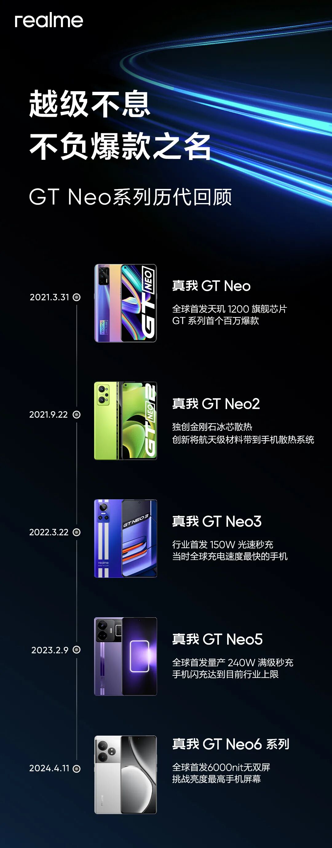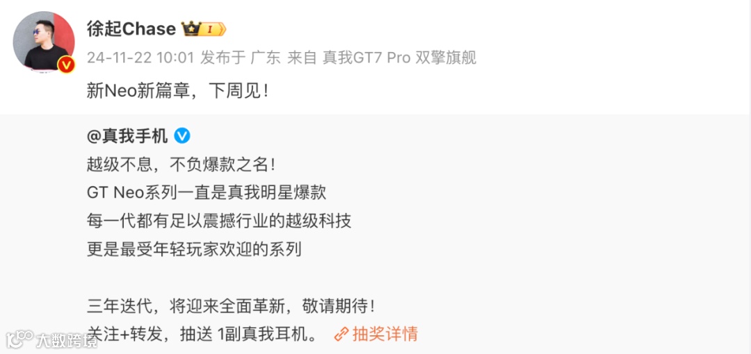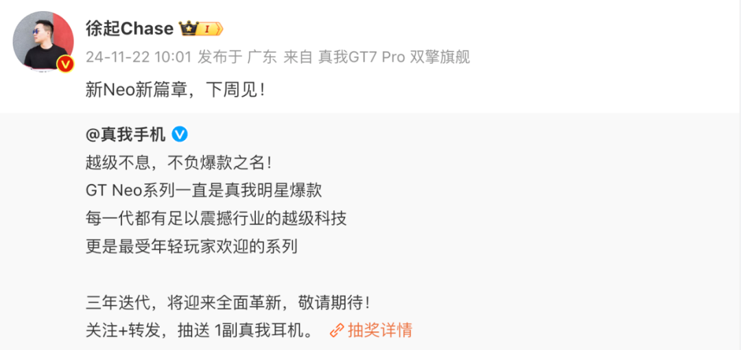 如上图所见,今日真我回顾了历代GT Neo系列,realme副总裁徐起称「新Neo新篇章,下周见!」暗示新机即将到来。
