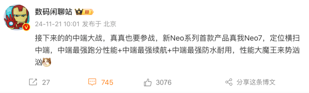 配置上,据爆料博主数码闲聊站暗示:真我Neo7或横扫中端,将带来中端最强跑分性能、中端最强续航、中端最强防水耐用,可能配备7000mAh超级巨无霸大电池,机身厚度在8.5mm左右。