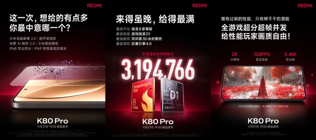 最后就是红米这边了。昨日红米宣布品牌标识焕新,变成红色设计的「REDMI」,并预热K80系列将于11月27日19点正式发布,Slogan是“大满贯双旗舰,当红不让”,今日官方公布了更多配置。