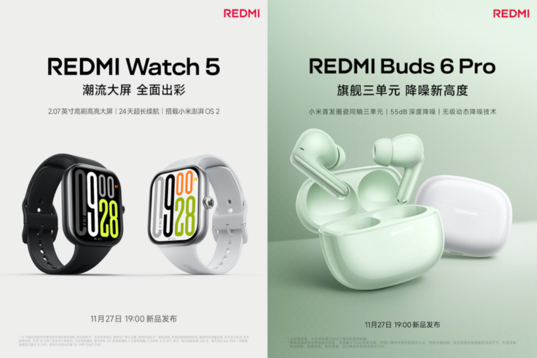 另外,11月27日红米也会更新手表REDMI Watch 5和新款耳机REDMI Buds6 Pro,有感兴趣的小伙伴吗?
