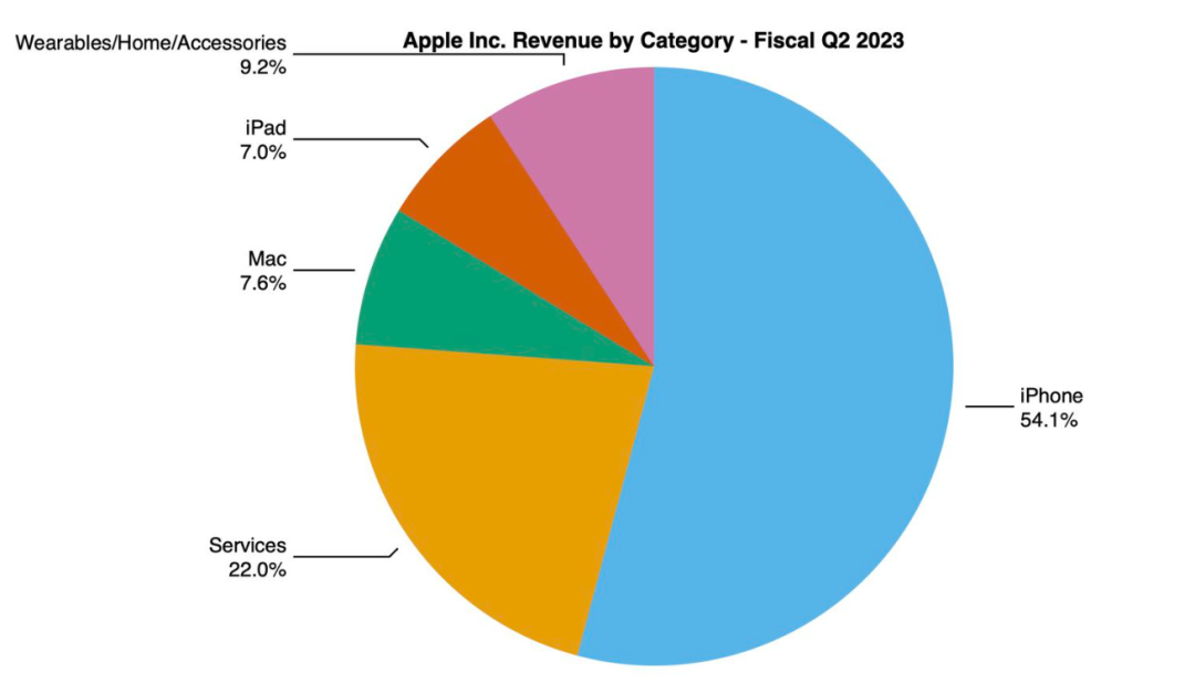 具体品类上,iPhone该季为苹果贡献了513.3亿美元营收,占比约54.1%,同比增长1.5%;服务类业务是苹果营收第二大来源,第二财季营收达209亿美元,同比增长5.5%;Mac类产品营收71.68亿,同比下跌31.3%,占比约7.6%。