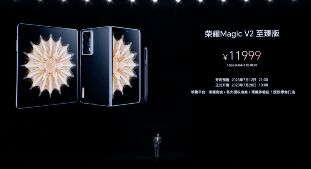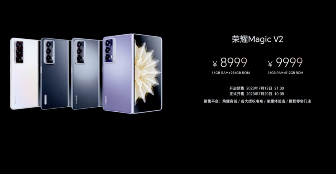 价格上,荣耀Magic V2:16+256GB版售价8999元,16+512GB版售价9999元;荣耀Magic V2 至臻版(含手写笔) 16GB+1TB版售价11999元。目前已开启预售,将于7月20日10:08正式开售。