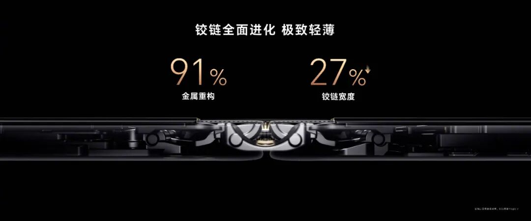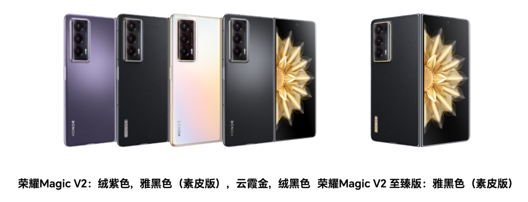 据官方介绍,荣耀Magic V2采用自研盾构钢,榫卯式一体成型,荣耀鲁班钛金铰链,首创水滴形弯折设计,内屏折叠能力高达40万次以上,支持多角度悬停。提供雅黑(素皮)、绒黑/绒紫(AG玻璃)、云霞金(亮面玻璃)4个配色,至臻版的雅黑同样是素皮,但logo做了金色处理,同时折叠处的外框有类似棋盘格的纹理图案,最终素皮版轻至231g,薄至9.9mm。