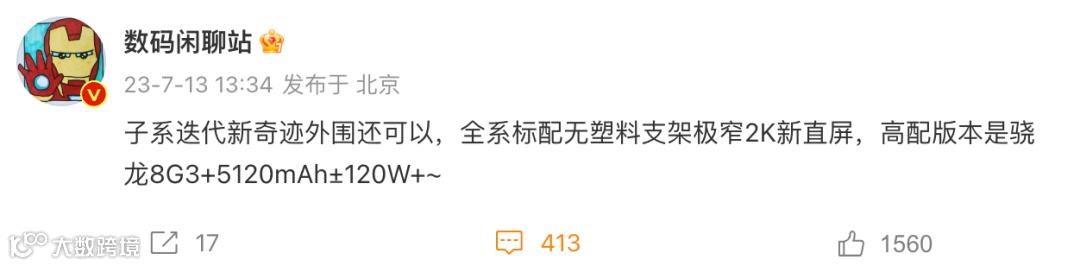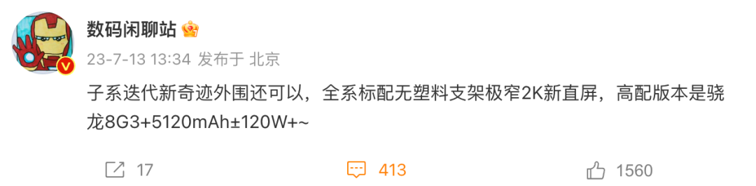 据其暗示,Redmi K70系列全系标配无塑料支架极窄2K新直屏,高配版本(预计Redmi K70 Pro)搭载骁龙8 Gen3处理器、5120mAh±电池、120W+有线快充。作为补充,早前爆料称Redmi K70系列虽然全员取消屏幕塑料支架,但中框还是塑料,标配新工艺喷砂塑料中框+玻璃机身,质感有提升,以及有可能配备3X±直立中长焦。