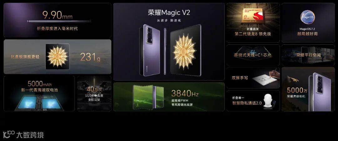 核心配置上,荣耀Magic V2搭载骁龙8 Gen2领先版(超大核主频3.36GHz),也是首款搭载8 Gen2超频版的折叠屏手机,此外LPDDR5X,UFS 4.0也是标配,还配备自研射频增强芯片C1、独立安全存储芯片,蝉翼液冷散热,搭载荣耀新一代青海湖双电池,5000mAh电池,66W有线充电,没有无线充电,运行基于Android 13的MagicOS 7.2,支持分屏双空间独立运行、智慧隐私通话2.0、全新悬停交互体验等。