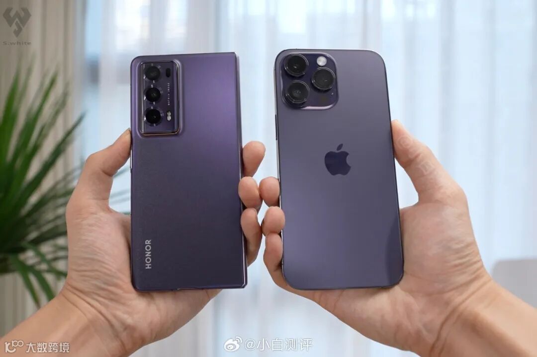 而荣耀Magic V2的价格刚好和iPhone 14 Pro Max官网起售价一致,我们拍了几张对比照,不知道大家会怎么选?