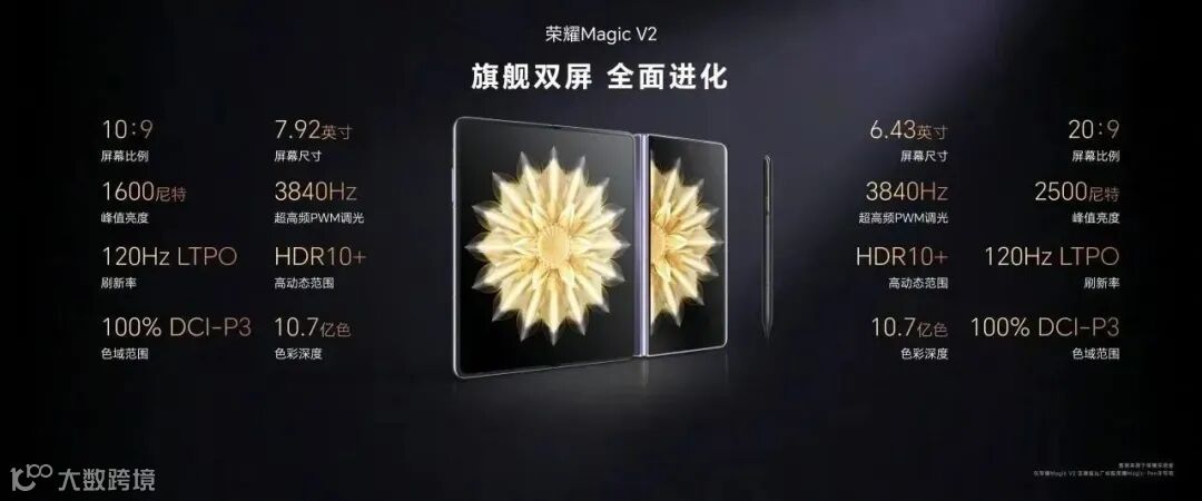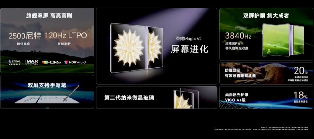 荣耀Magic V2主要配置:6.43英寸2376*1060分辨率20:9的OLED外屏,峰值亮度2500nit,第二代纳米微晶玻璃盖板;7.92英寸2156*2344分辨率9.8:9的OLED内屏,峰值亮度1600nit,内外屏均支持1-120Hz LTPO自适应屏幕刷新率、3840Hz PWM高频调光、手写笔、内外屏均采用京东方Q9发光器件、全新像素排列方式。