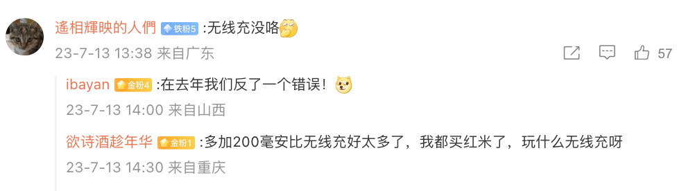 另外目前就Redmi K70系列的配置来说,关于无线充电有争议,有网友称K70 Pro电池变大,似乎意味着无线充没了?但也有网友认为K70系列可能会继续升级无线充电,比如上50W无线充。你觉得偏性价比定位的Redmi K系列有必要坚持无线充电吗?