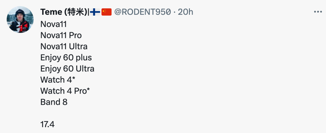 爆料达人teme称4月17日华为或将带来多款新品,具体有:华为nova 11、nova 11 Pro、nova 11 Ultra,华为畅享60系列、华为Watch 4系列、华为手环8。