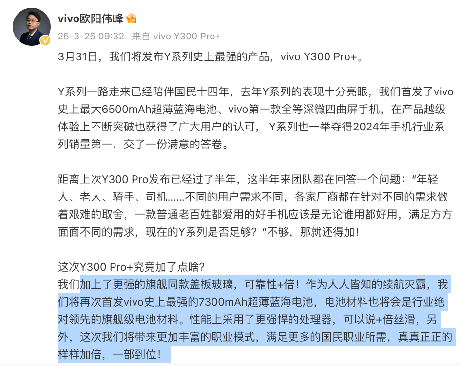 如上图所见,vivo产品副总裁欧阳伟峰发文预热,将在3月31日发布vivo Y系列史上最强的产品:vivo Y300 Pro+,称Y300 Pro+加上了更强的旗舰同款盖板玻璃,可靠性+倍,首发vivo史上最强的7300mAh超薄蓝海电池,带来更加丰富的职业模式,满足更多的国民职业所需。