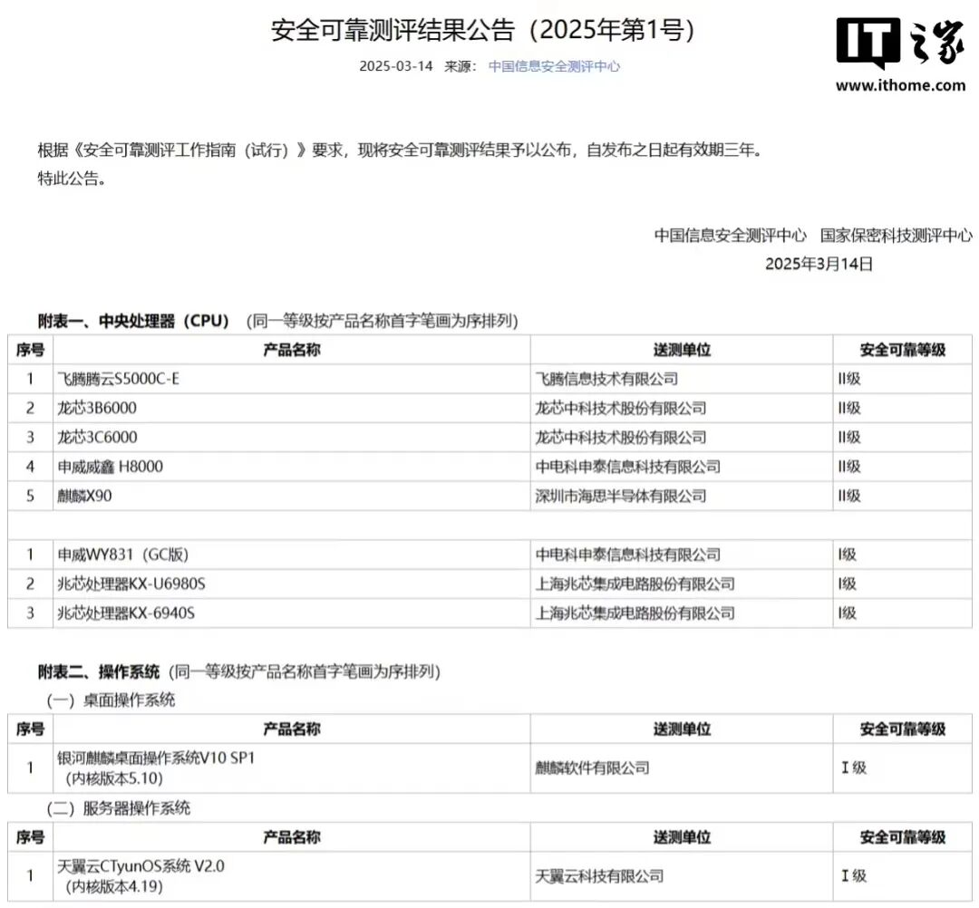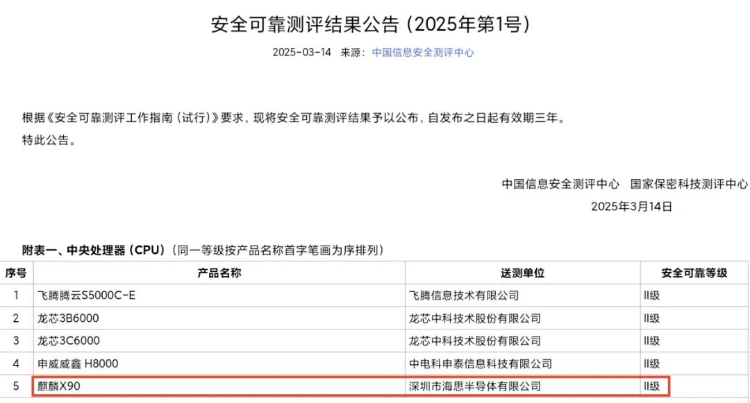 近日,中国信息安全评测中心发布了一份安全可靠测评结果公告(2025 年第1号),曝光了麒麟X90处理器。