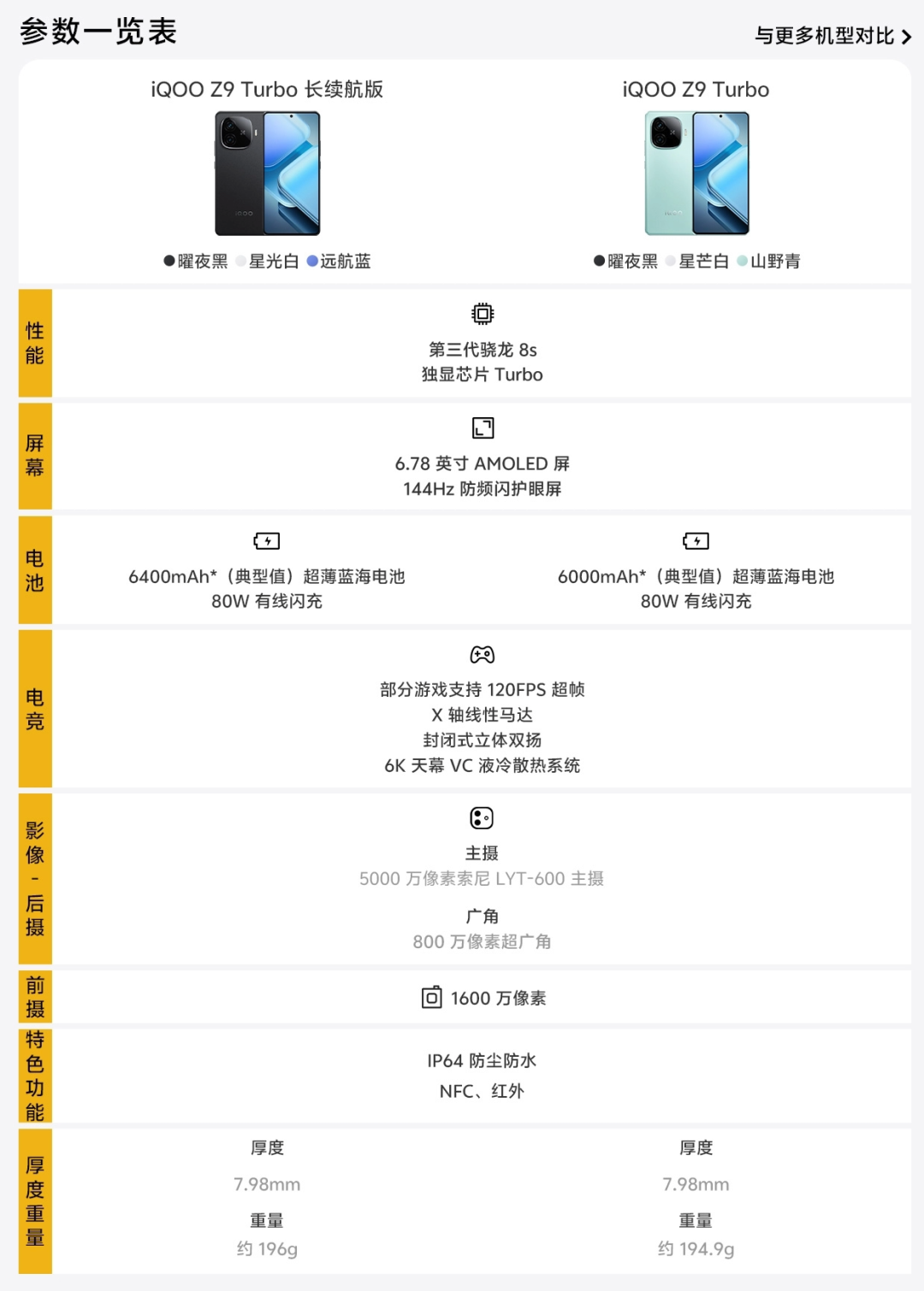 据了解,iQOO Z9 Turbo长续航版本主要配置为:6.78英寸1.5K 144Hz华星光电C8直屏,3840Hz PWM+DC调光,短焦光学屏下指纹,7.98mm/196g,骁龙8s Gen3、独显芯片Turbo、6400mAh电池+80W充电、前置16MP,后置50MP主摄有OIS(LYT-600)+8MP超广角,红外、NFC、X轴马达、双频GPS、双扬、IP64等。
