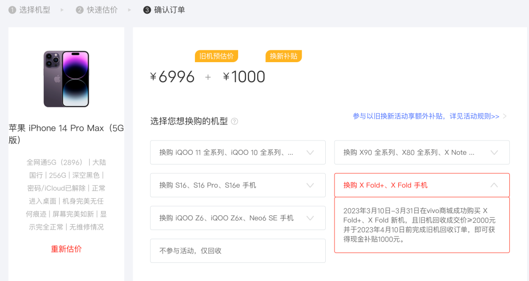 以iPhone 14 Pro Max 256GB为例,参与vivo的以旧换新活动,预计价格是6996元预估价+1000元补贴=7996元。而目前全新14 Pro Max 256GB第三方价格好像是8699元,不知道大家觉得vivo这波以旧换新价格如何?