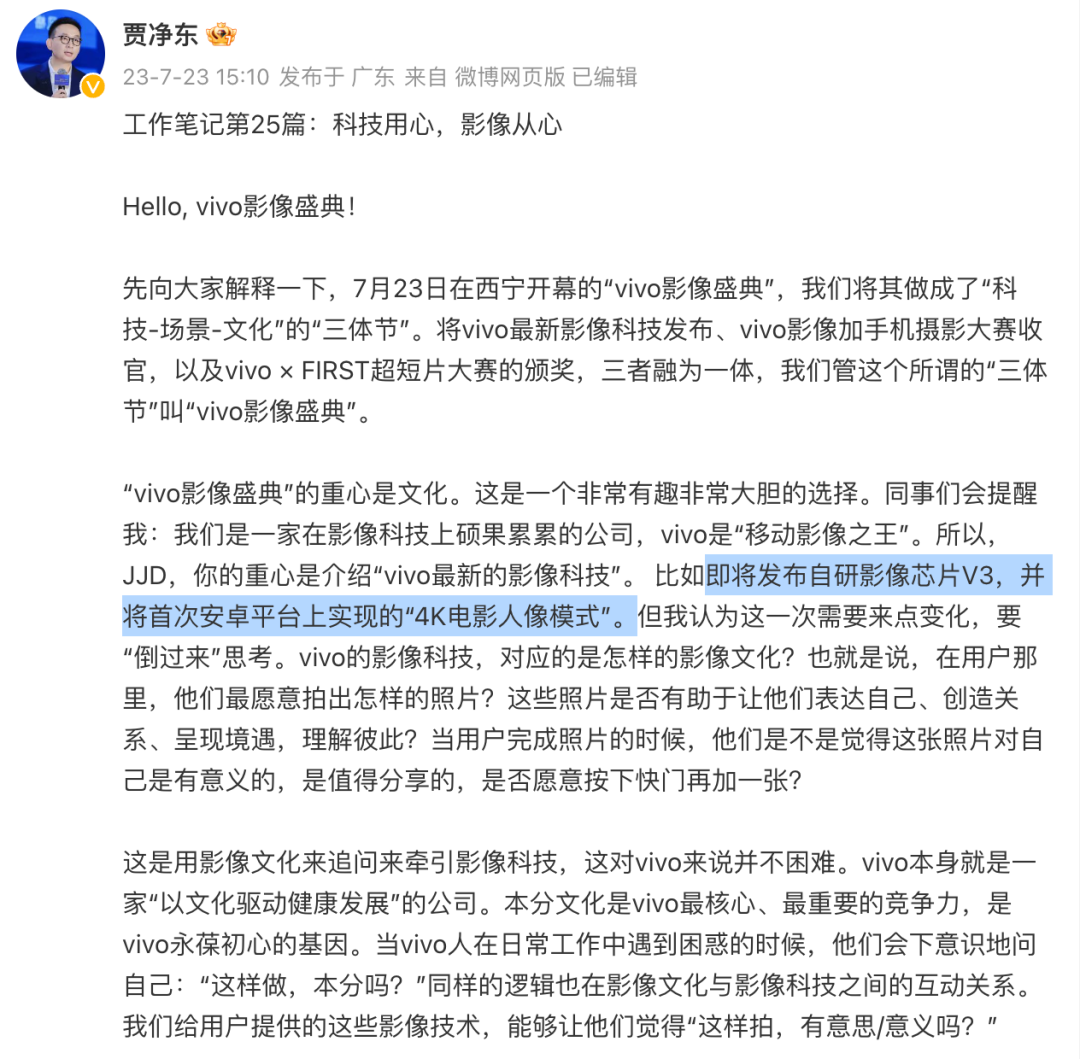 vivo品牌副总裁贾净东在微博宣布,7月23日即今天vivo影像盛典在西宁开幕,本次活动周期为7.23-7.31,将vivo最新影像科技发布、vivo影像加手机摄影大赛收官,以及vivo × FIRST超短片大赛的颁奖融为一体,届时也将发布自研影像芯片V3。