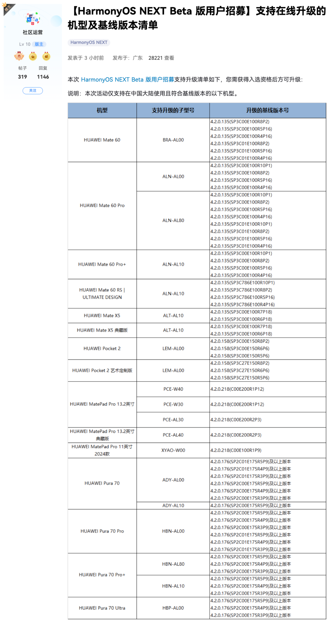 支持在线升级HarmonyOS NEXT Beta版的机型及基线版本清单具体见上图, 华为Mate 60系列、Mate X5、Pura 70系列、Pocket 2系列、MatePad Pro 13.2 英寸、MatePad Pro 11英寸2024款等15款(手机/平板)设备开启HarmonyOS NEXT Beta版用户招募活动。