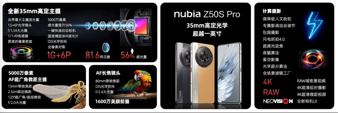 影像方面,努比亚Z50S Pro前置16MP,主打35mm定制光学系统,官方预热称的“超越一英寸”主要指努比亚有效通光孔径高达5.21mm,主摄进光量超越一英寸,可以带来更好的光学虚化和更优质的夜景成像。具体后置三摄50MP主摄 有OIS(1G+6P 35mm)+50MP超广角微距+8MP长焦 有OIS。