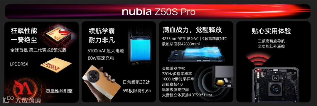 核心配置上,努比亚Z50S Pro搭载骁龙8 Gen2领先版(CPU超大核主频最高3.36GHz),配备5100mAh电池、80W有线充电,4233mm²仿生设计VC散热、9颗高精度NTC温度传感器,X轴线性马达、立体双扬声器、红外遥控、NFC、USB 3.1 Gen1,运行基于Android 13的MyOS 13,官方称“再次挑战全网最少广告 ”。