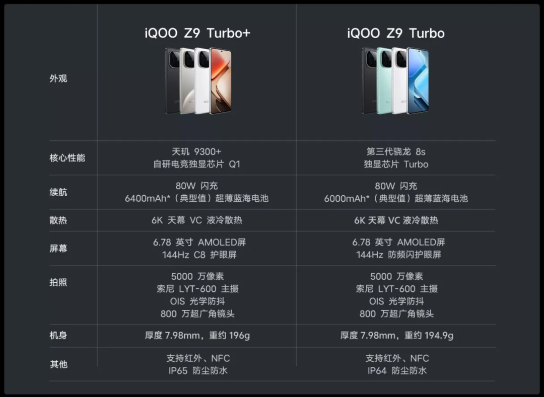作为参考,今年4月发布的iQOO Z9 Turbo主要配置有:6.78英寸2800*1260分辨率的AMOLED直屏,华星光电C8材质,3840Hz PWM调光+全亮度DC调光,144Hz刷新率,屏下指纹,塑料后盖,机身厚约7.98mm重约194.6g,前置16MP,后置双摄50MP主摄有OIS(光喻LYT-600)+8MP超广角,搭载骁龙8s Gen3,LPDDR5X、UFS4.0,配备独显芯片Turbo,6000mAh蓝海电池,80W有线充电,6K VC液冷散热,封闭式立体双扬,X轴马达、IP64、NFC、红外遥控、单频GPS等,12+256GB版发售价1999元起,大家觉得小改款的Turbo会卖多少钱?