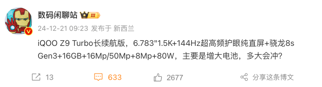 如上图所见,爆料达人数码闲聊站称iQOO Z9 Turbo长续航版将采用6.783英寸1.5K 144Hz刷新率的超高频护眼纯直屏、搭载骁龙8s Gen3,配备16GB内存,前置16MP,后置双摄50MP+8MP,80W有线充电,主要是增大电池。结合此前消息,预计电池容量至少6400mAh,有望在最近一个月发布,或许可以关注下续航表现。