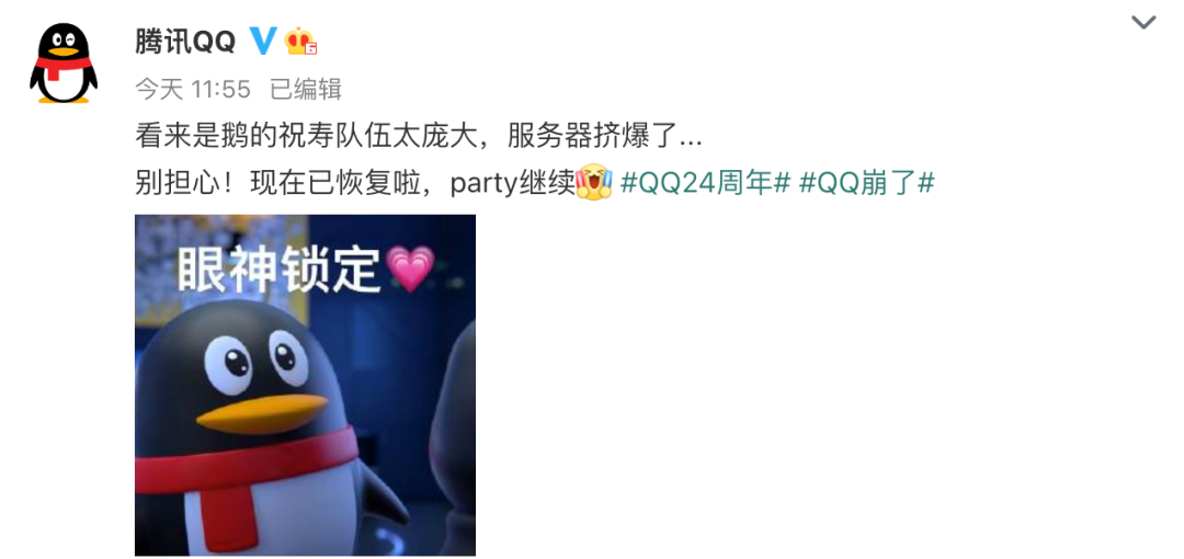 随后腾讯QQ官方回应称:「看来是鹅的祝寿队伍太庞大,服务器挤爆了...别担心!现在已恢复啦,party继续」。