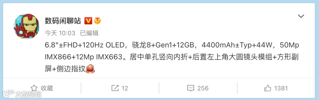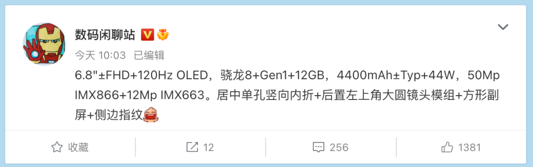 据数码闲聊站暗示,vivo X Flip主要配置有:6.8英寸左右FHD+分辨率120Hz刷新率的居中单挖孔OLED屏,竖向内折设计,侧边指纹,搭载骁龙8+处理器、提供12GB运存,电池容量4400mAh左右、44W有线充电,后置左上角大圆镜头模组+方形副屏,具体后置双摄50MP主摄索尼IMX866+12MP IMX663(暂时不确定是超广角还是人像镜头)。
