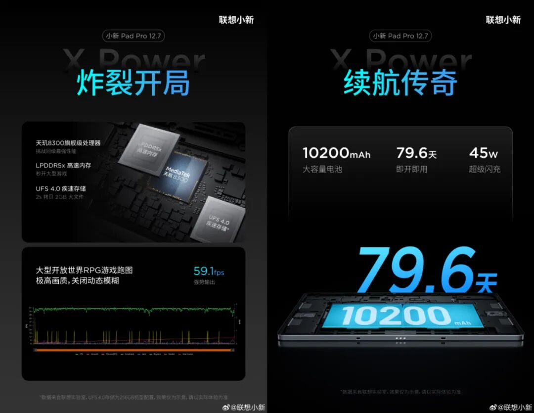 核心配置上,小新Pad Pro 12.7搭载联发科天玑8300处理器,配备LPDDR5X、UFS4.0,配备10200mAh电池、45W充电。