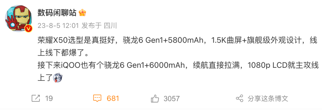 据数码闲聊站爆料,iQOO也有一款骁龙6 Gen1新机待发布,预计采用1080P的LCD屏、6000mAh大电池续航拉满,主攻线上市场。