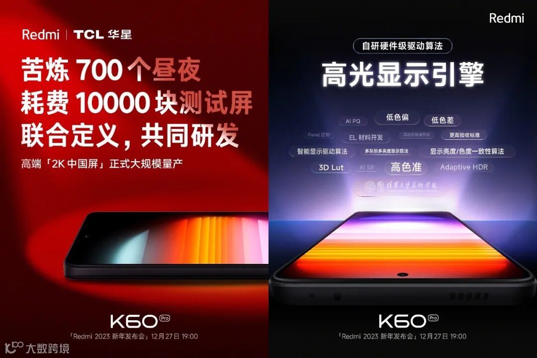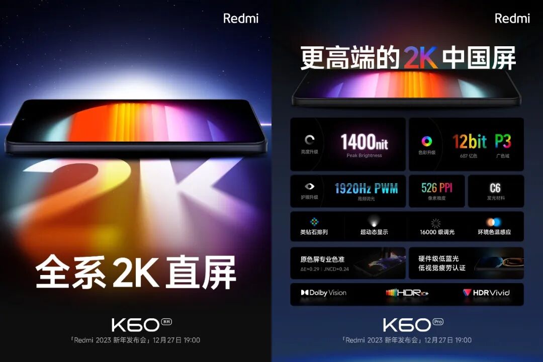 据官方预热,Redmi K60系列全系2K直屏。其中K60 Pro的2K屏官方预热海报称其是“更高端的2K国产屏”:1400nit 高光峰值亮度,12bit/687亿色 全链路 P3 广色域,1920Hz PWM 调光、硬件级低蓝光。