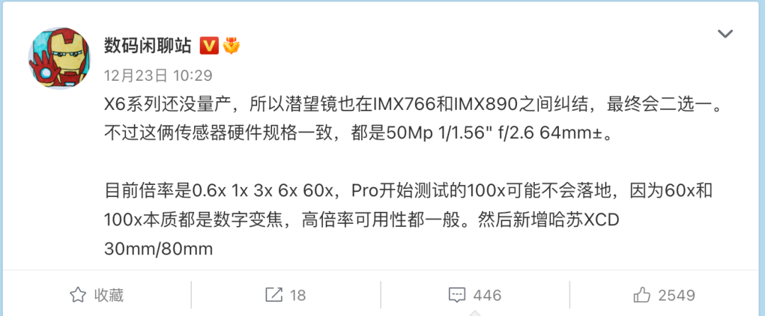 据爆料达人透露,Find X6系列还没量产,目前潜望镜头还在索尼IMX766和IMX890之间纠结,最终会二选一。细节上,Find X6 Pro开始测试的100x可能不会落地,因为60x和100x本质都是数字变焦,高倍率可用性都一般,新增哈苏XCD 30mm和80mm。供大家参考。