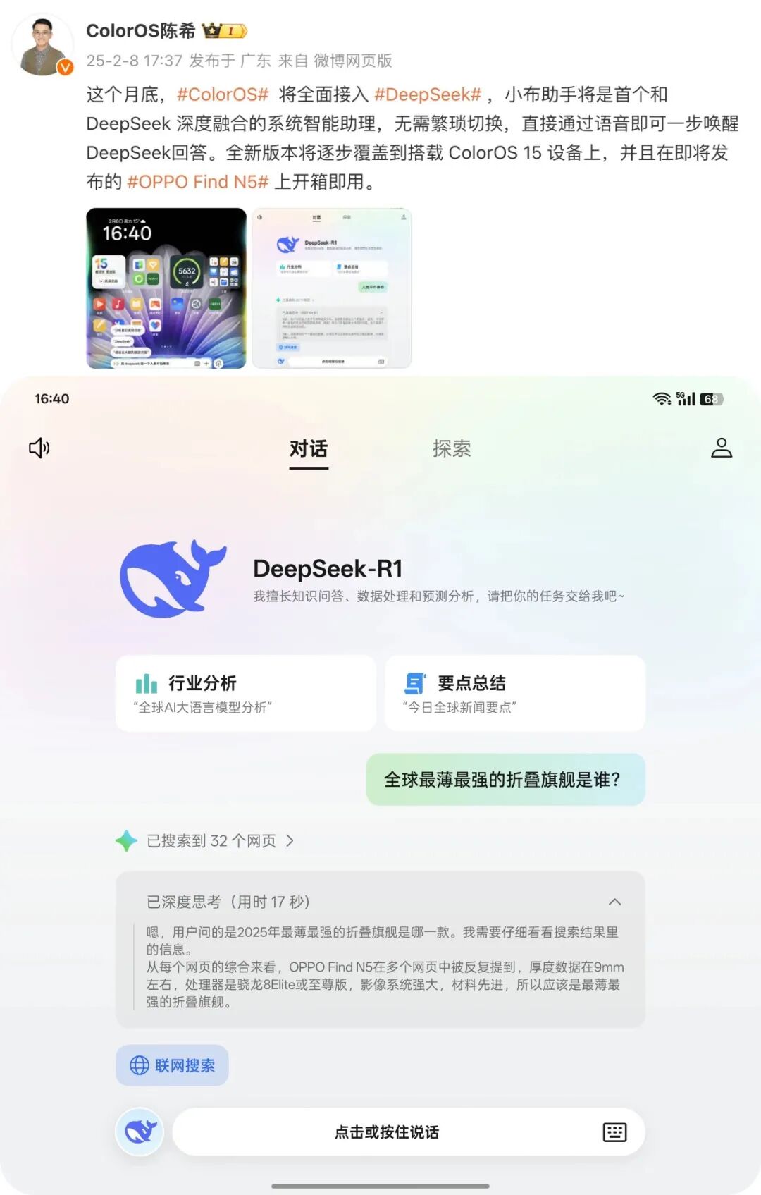 【OPPO/一加】预告本月底ColorOS将全面接入,届时新版本将逐步覆盖,而将于下周发布的Find N5出厂即可用,支持联网搜索;(PS.真我未官宣,但个人猜测应该是前后脚)