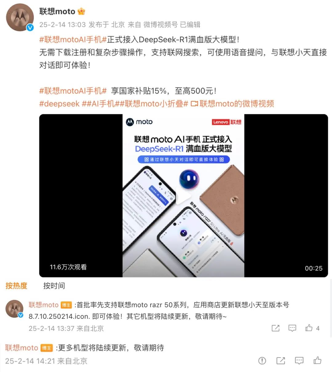 【摩托罗拉】首批支持联想moto razr 50系列,官方称无需下载注册和复杂步骤操作,支持联网搜索,可使用语音提问,与联想小天直接对话即可体验,具体需要将联想小天需更新至8.7.10.250214.icon.版本,其它机型将陆续更新。