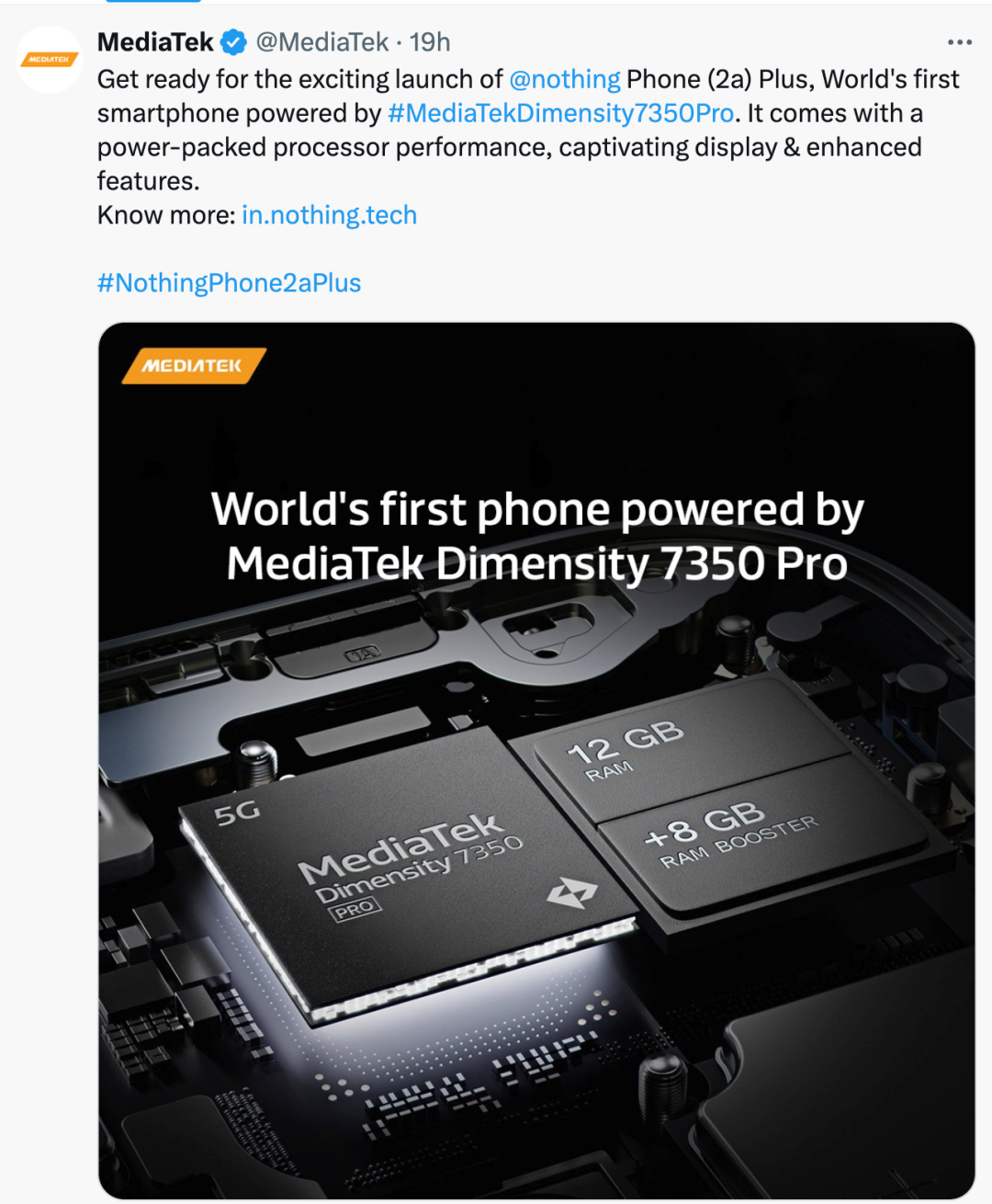 核心配置上,联发科官方介绍Nothing Phone (2a) Plus将首发搭载天玑7350 Pro。
