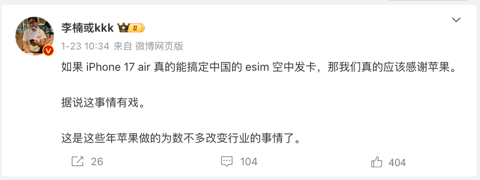 近日前魅族科技CMO、现怒喵科技创始人李楠在微博暗示iPhone 17 Air或能搞定中国的eSIM,其表示“据说这事情有戏”。大家觉得eSIM方案是未来大势所趋吗?有开通过的小伙伴也可以分享下使用体验和资费情况~