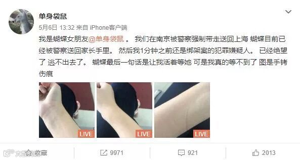 5月6日,蝴蝶父母以绑架为由报警逮捕了袋鼠,同时蝴蝶再次被送回家长手中再次断联,而袋鼠在被关押6小时后释放,目前状态极为糟糕。