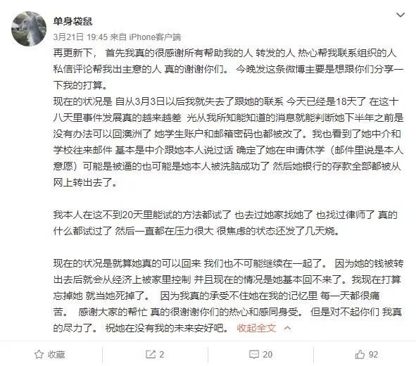 据小微目前联系上的志愿者表示,袋鼠目前已经休学回国处理这件事,身体状况很不好并由父母朋友陪伴身边。