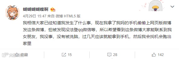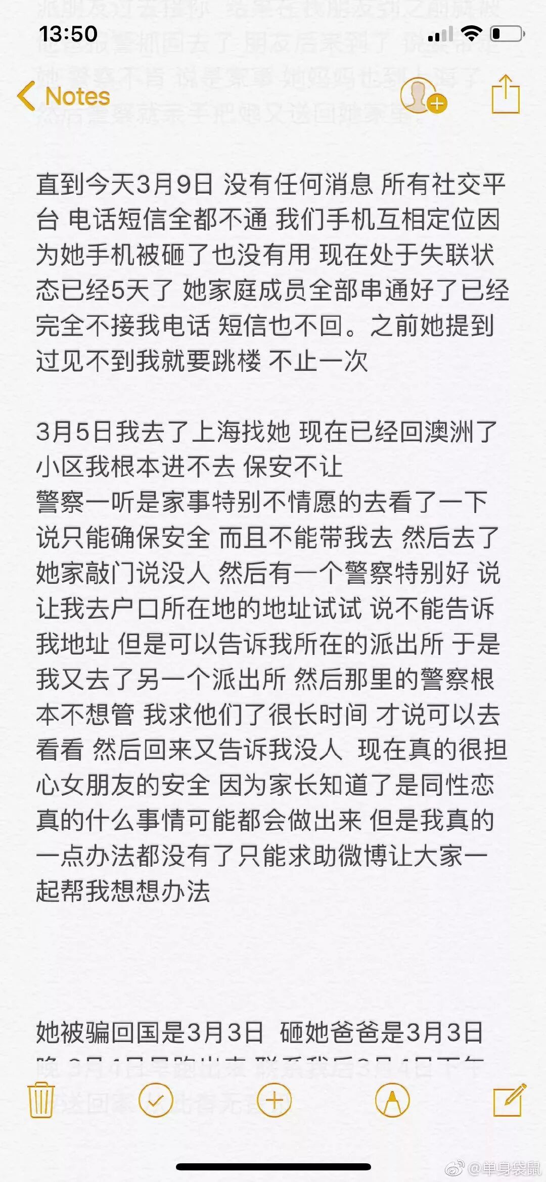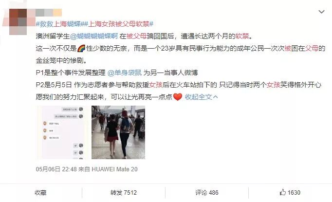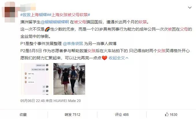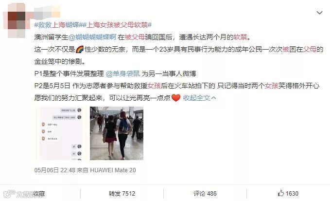 蝴蝶因为出柜,自3月被父母带回国软禁了两个月(期间,被断绝所有通讯方式,父母轮流24小时监察,女孩身份证护照都被父母销毁,同时被逼迫签下澳洲休学申请书);