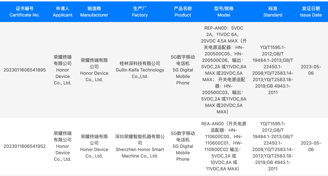 3C认证显示荣耀型号为REA-AN00、REP-AN00的两款5G新机近日双双现身,分别配备66W充电器、100W充电器,据悉分别对应荣耀90和荣耀90 Pro。爆料还称荣耀90 Pro虽然配备的是100W充电器,支持的是全新20V 4.5A-90W快充协议