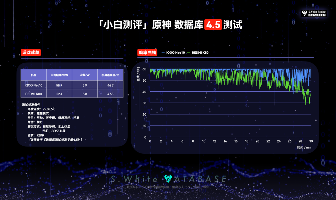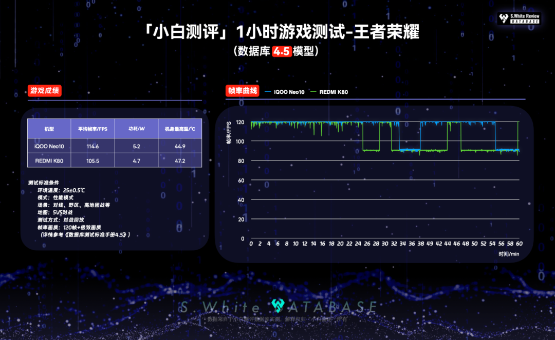 iQOO Neo10:(1)1小时《王者荣耀》测试:平均帧率114.6FPS,功耗5.2W,机身最高温度44.9℃;(2)《原神》数据库4.5测试:平均帧率58.7FPS,功耗5.9W,机身最高46.7℃;(3)超高压场景《星穹铁道-黄金的时刻》:平均帧率51.4FPS,功耗7.3W,机身最高48.9℃。(系统基于iQOO Neo10测试时的最新版本PD2425D_A_15.0.11.11.W10.V000L1测试)
