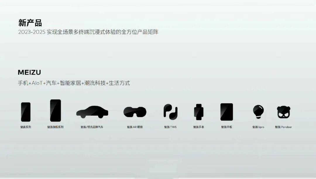 曝光的这组PPT显示,魅族2023-2025年将打造手机+AIoT+汽车+智能家居+潮流科技+生活方式,全场景多终端沉浸式体验的全方位产品矩阵,有魅族系列、魅族旗舰系列、魅族/领克汽车、魅族AR眼镜、TWS耳机、手表、平板等新品。