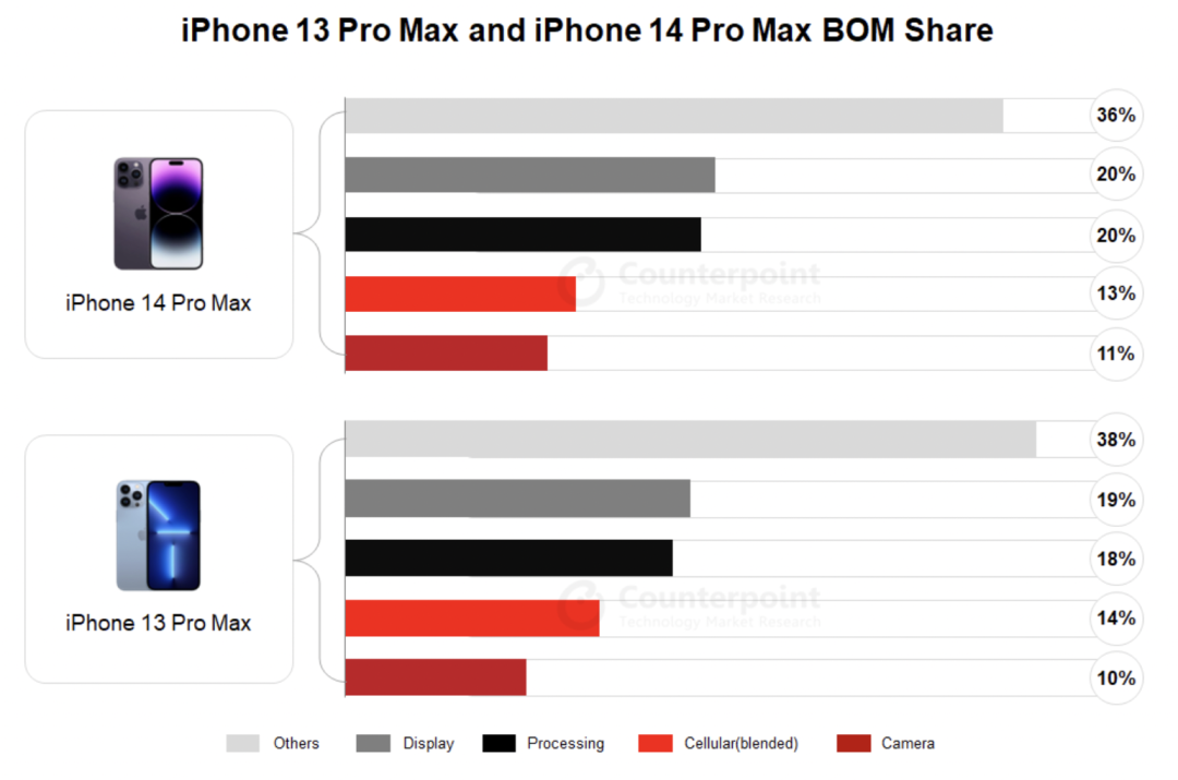 分析师表示:一台128GB版的iPhone 14 Pro Max混合物料清单(BoM)成本约为464美元(折合人民币约3181元),较iPhone 13 Pro Max增加3.7%。其中自研芯片(A16、电源管理、音频、连接和触控芯片等)占总BoM成本的22%以上,屏幕、摄像头成本也有增加,混合蜂窝组件成本则略有下降。