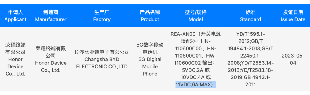 3C认证显示荣耀有一款型号为REA-AN00的5G新机在5月4日现身,配备66W充电,据悉其对应荣耀90系列的一款。(PS.上代荣耀80系列全系均为66W充电,感觉荣耀现在似乎主攻续航方面,充电暂时不继续走高功率路线了?)