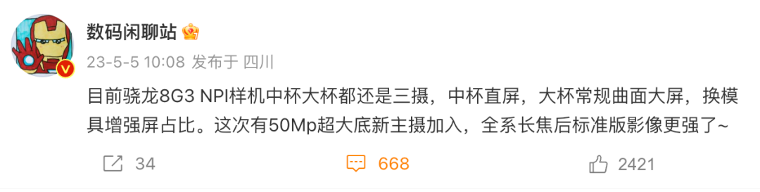 现据数码闲聊站暗示,小米14系列样机来看全系骁龙8 Gen3,中杯大杯都是后置三摄,中杯小米14是直屏,小米14 Pro是常规曲面大屏,换模具、增强屏占比,另外还有50MP的超大底新主摄加入,全系长焦,标准版影像更强了。