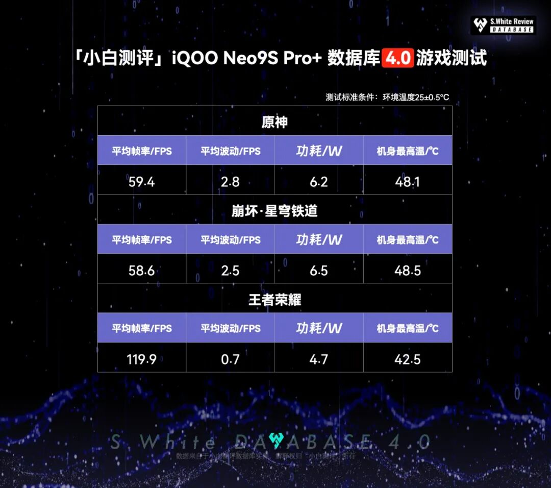 iQOO Neo9S Pro+游戏实测:《原神》数据库4.0模型下平均帧率59.4FPS,功耗6.2W,机身最高温度48.1℃;《星穹铁道》平均帧率58.6FPS,功耗6.5W,机身最高48.5℃;《王者荣耀》数据库4.0下平均帧率119.9FPS,功耗4.7W,机身最高温度42.5℃;
