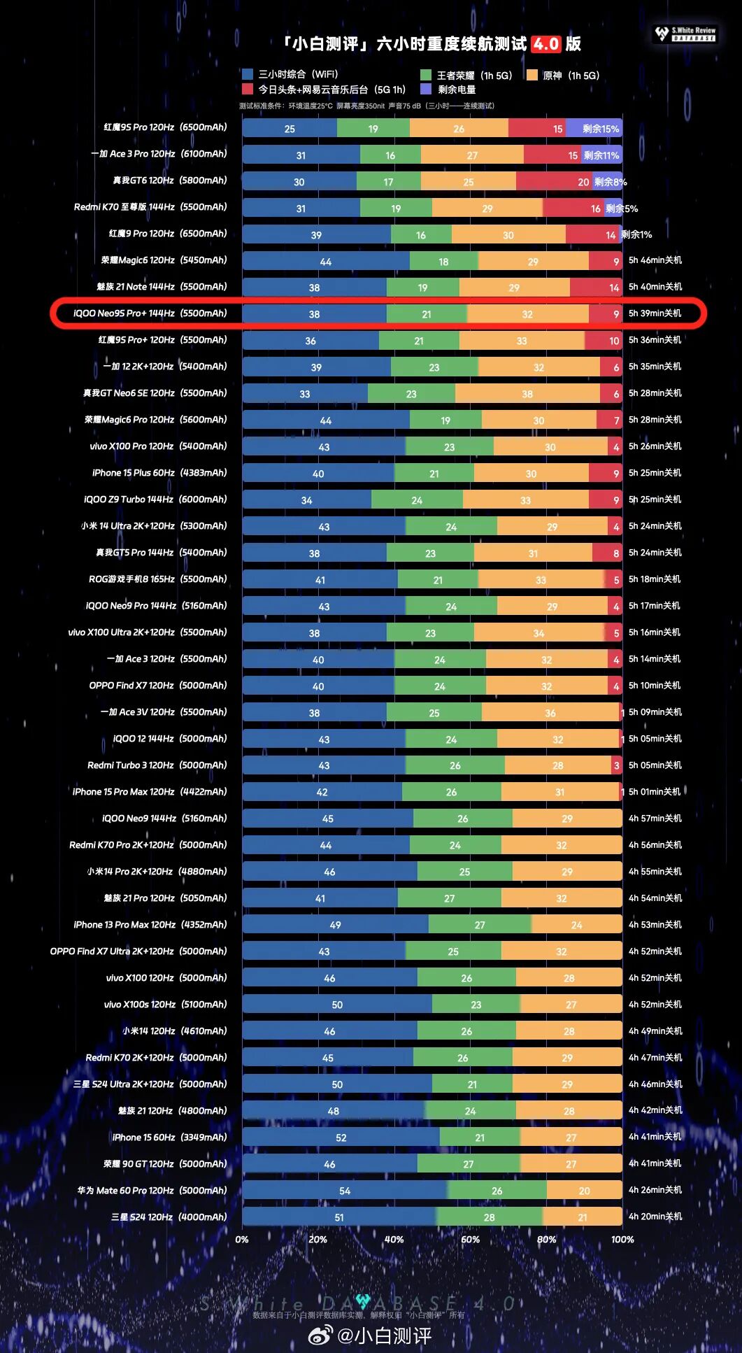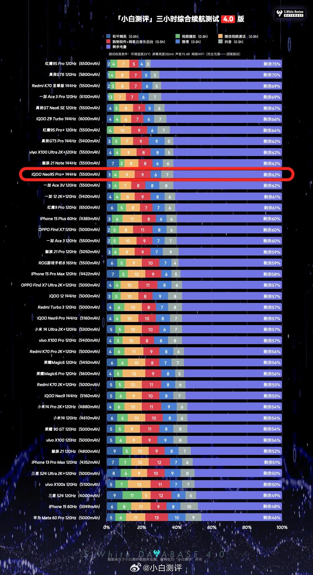 续航表现,实测iQOO Neo9S Pro+:1.5K屏幕分辨率,144Hz刷新率,三小时轻度续航测试剩余电量62%,六小时重度续航测试到5小时39分钟关机。