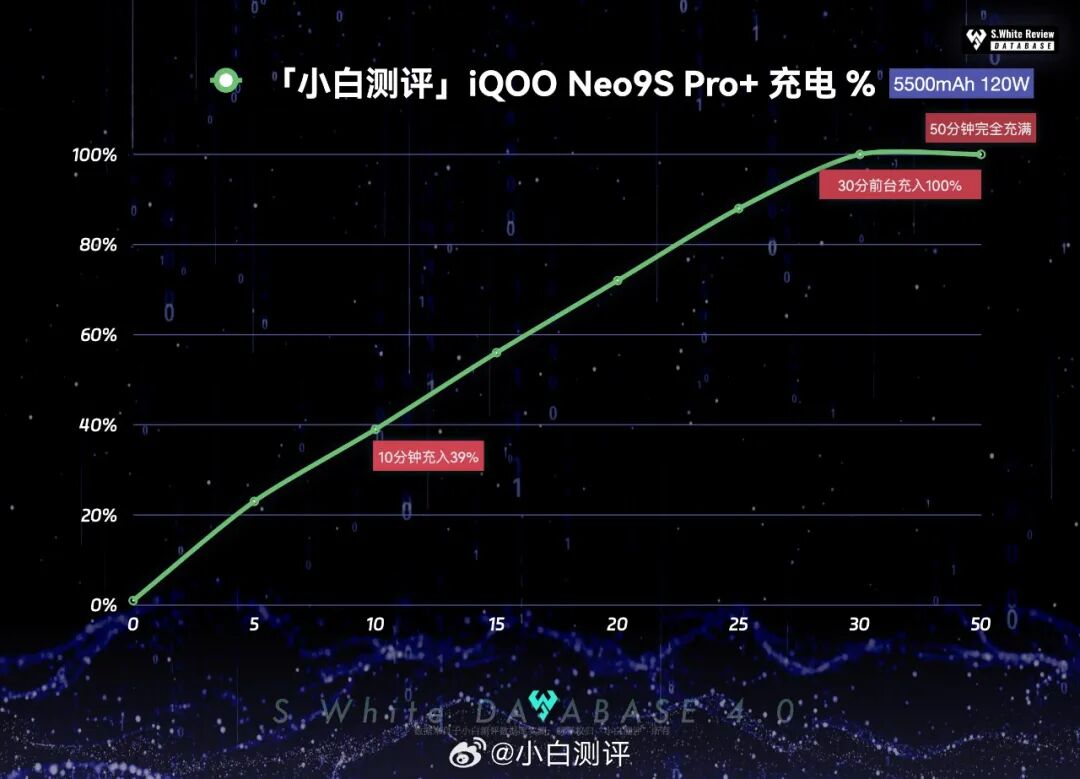 充电方面,在25℃标准环境中实测,5500mAh蓝海电池+120W充电功率的iQOO Neo9S Pro+:10分钟充入电量39%,30分钟前台充入100%,50分钟完全充满。