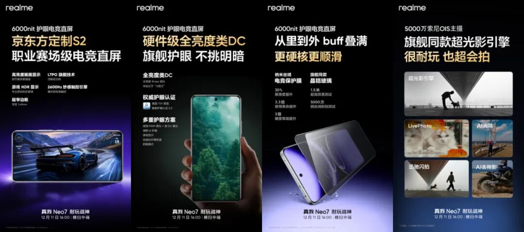 配置方面,官方预热称真我Neo7采用京东方定制S2电竞直屏,局部峰值亮度6000nit,高频PWM调光+类DC调光多重护眼方案,支持全亮度1Pulse调光,采用旗舰同款晶铠玻璃,后置为5000万像素索尼OIS主摄,支持旗舰同款超光影引擎。