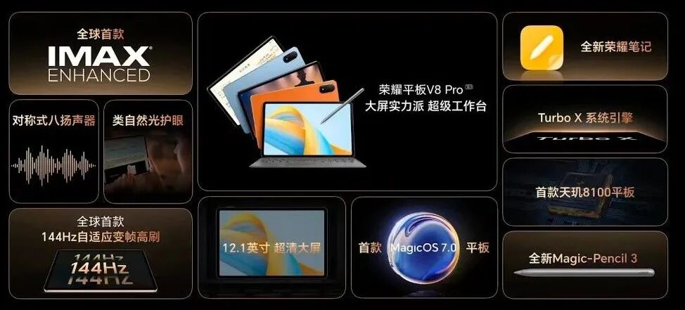 ,10050mAh电池+35W充电,预装基于Android 12的MagicOS 7.0,机身厚约6.64mm,585g,对称八扬声器等。